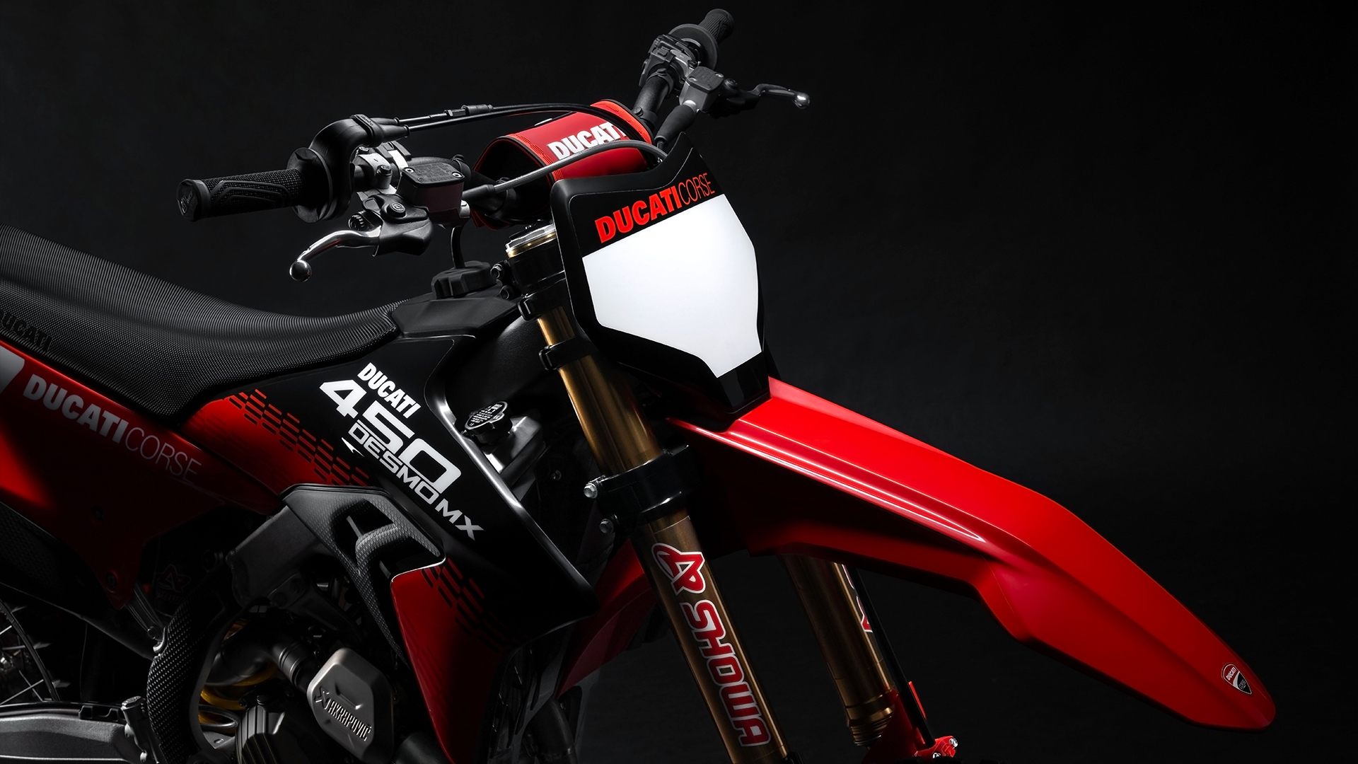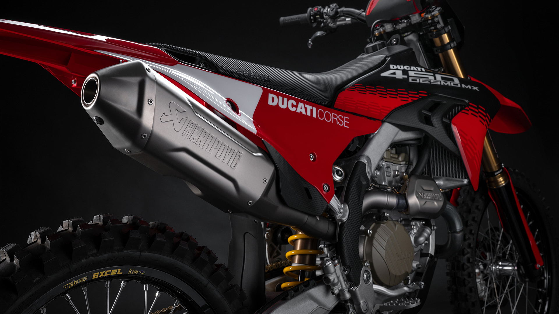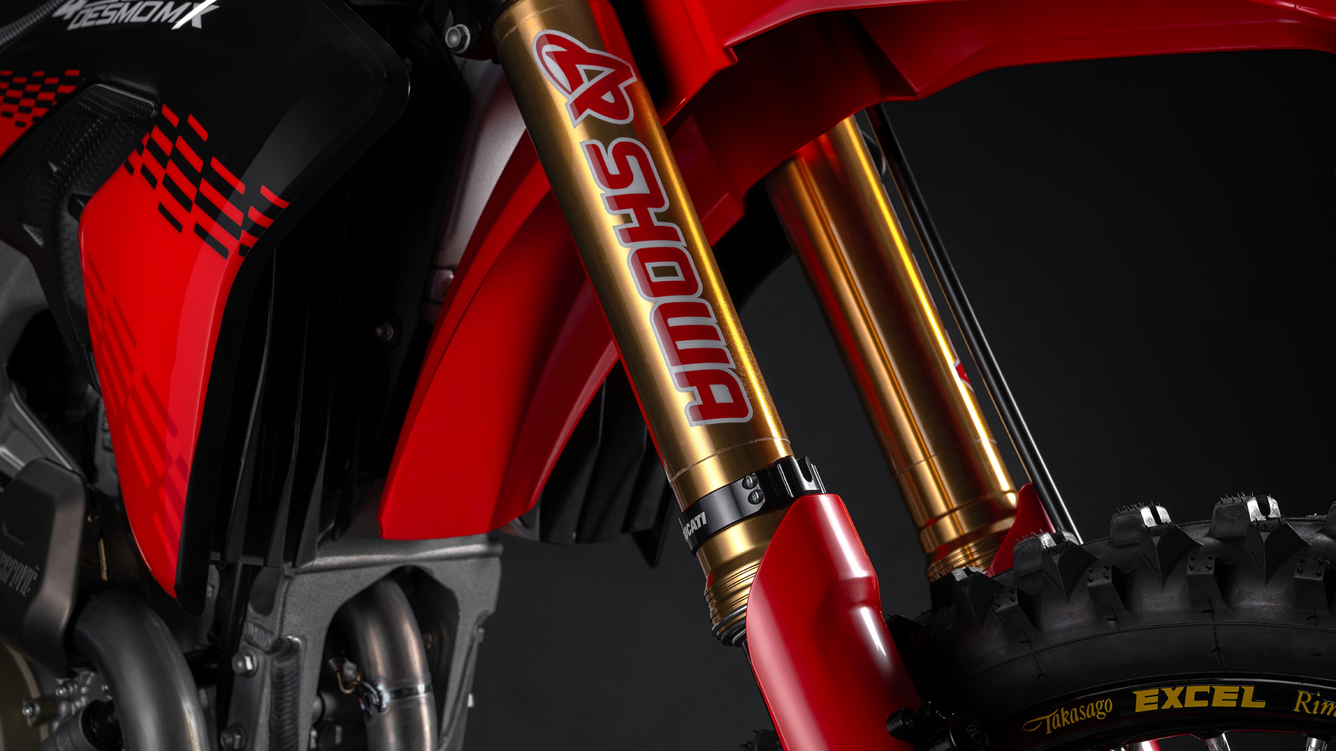 Desmo450 MX Factory jest wyposażony w kompletny tytanowy układ wydechowy Akrapovič z dedykowanym mapowaniem silnika, który redukuje masę (-1,7 kg), poprawia dostarczanie mocy i zapewnia stabilną krzywą momentu obrotowego. Zawieszenie Showa z powłoką Dark Kashima na goleniach widelca i korpusie amortyzatora oraz użycie tlenku tytanu (TiO) zapewnia lepszą płynność pracy oraz odporność na zużycie i odpryski.
