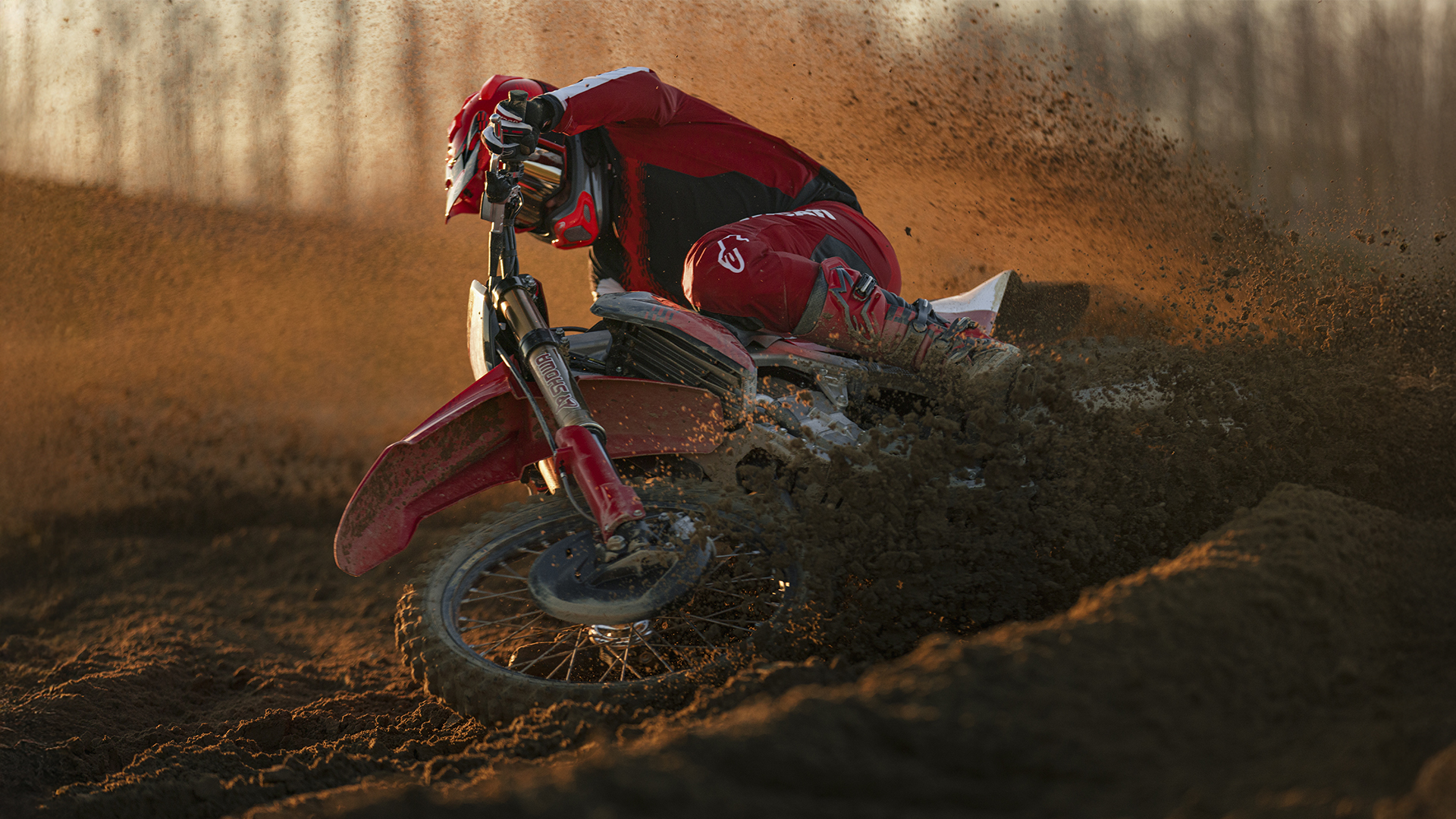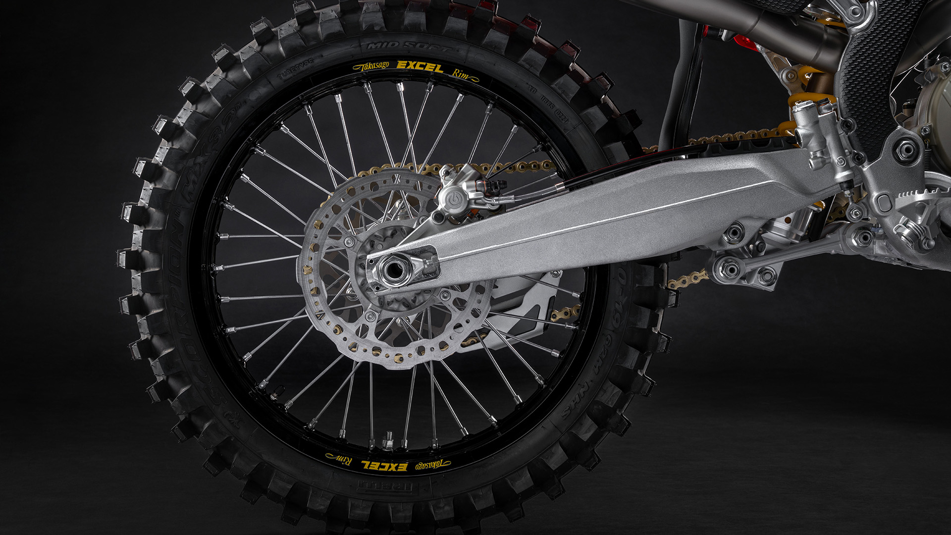 Półki wykonane z frezowanego stopu aluminium Ergal redukują masę o prawie 200 gramów. Osłona podwozia i osłona przedniej tarczy hamulcowej chronią przed błotem i kamieniami, a łańcuch O-ring RK MXU, taki sam jak w motocyklach fabrycznych, zapewnia trwałość i niezawodność.