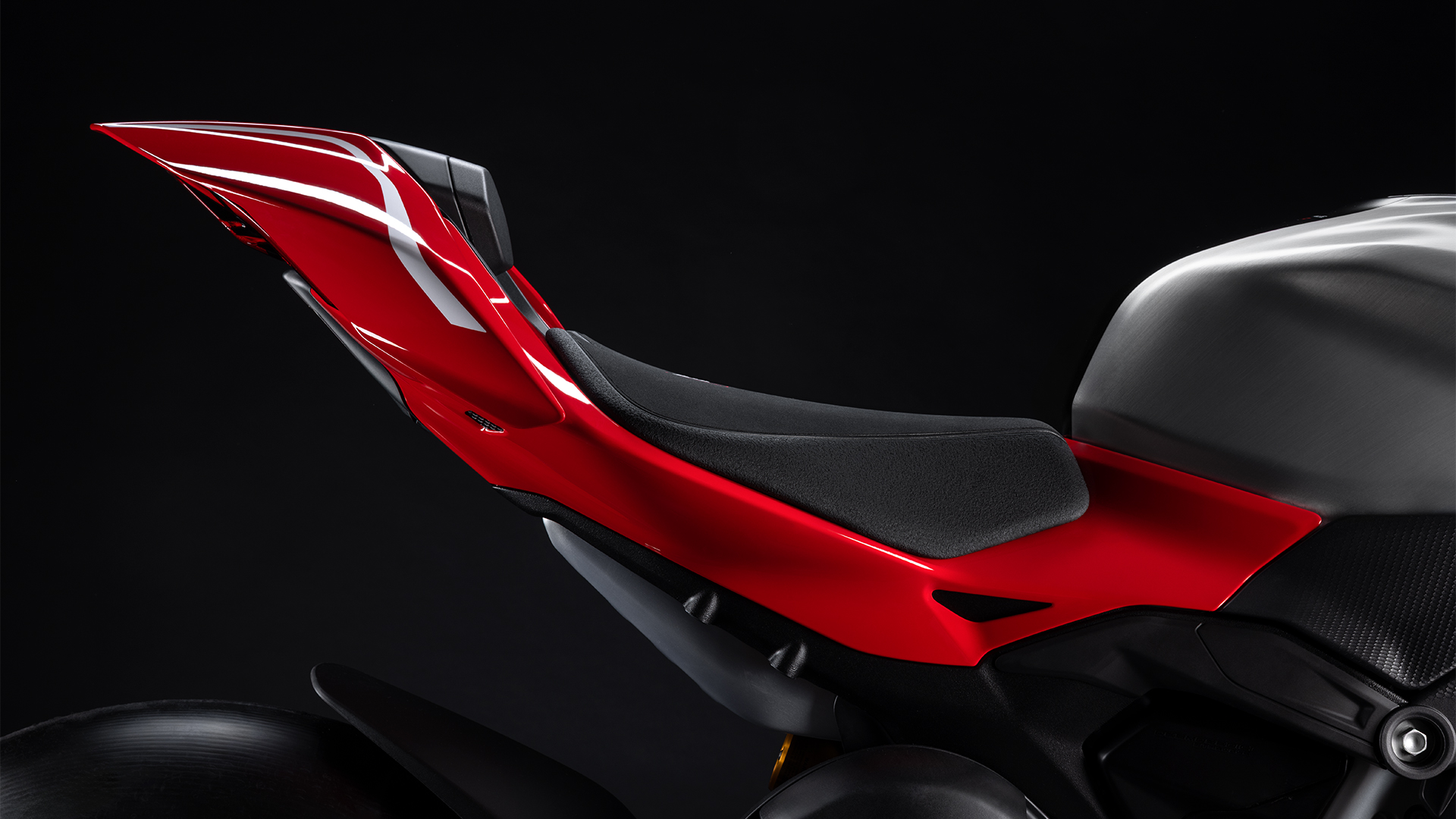 Układ zbiornika, siedziska i podnóżków zapewnia kierowcy jeszcze lepsze wsparcie podczas wyścigów, ułatwiając przyjęcie pozycji aerodynamicznej i poprawiając kontrolę podczas hamowania i przy pochylaniu się do wewnątrz zakrętu. Dzięki temu pełne wykorzystanie osiągów Panigale V4 R jest łatwiejsze i mniej męczące, zarówno podczas jednego okrążenia, jak i podczas dłuższej jazdy.